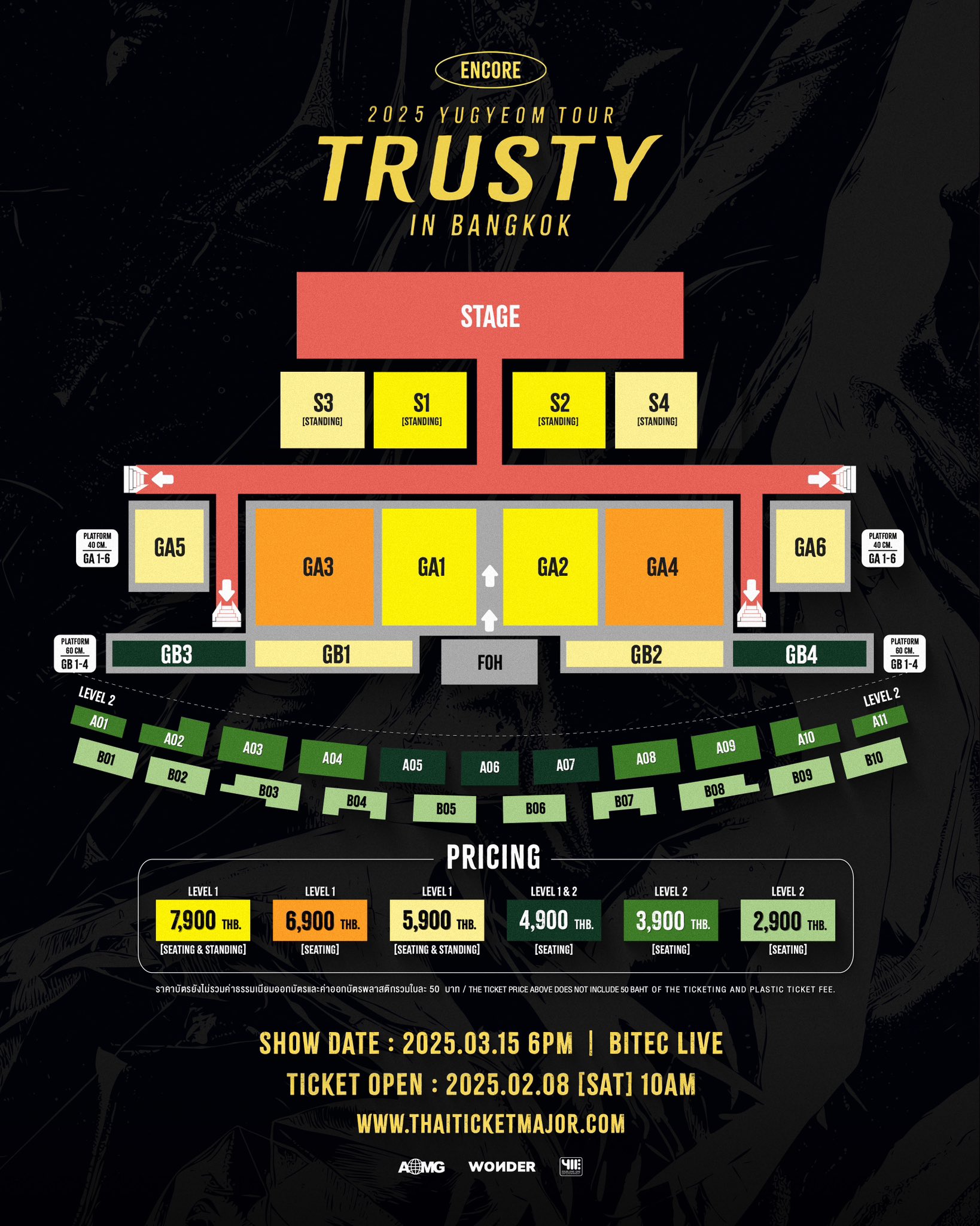 ขณะเดียวกันอีกหนึ่งหน้าที่บนอีกเส้นทางที่หลายคนพอจะทราบกันดีว่าภายในปีนี้ ยูคยอม (YUGYEOM) #YUGYEOM ต้องอำลาวงการชั่วคราวเพื่อไปเข้ากรมรับใช้ชาติอีกรายแล้ว คอนเสิร์ต “2025 ยูคยอม ทัวร์ [ทรัสตี้] อังกอร์ อิน แบงคอก” (2025 YUGYEOM TOUR [TRUSTY] ENCORE IN BANGKOK) #2025TRUSTY_ENCORE_IN_BANGKOK จัดโดย โฟร์ วัน วัน เอ็นเตอร์เทนเม้นท์ (Four One One Entertainment หรือ 411ent) ของ กึ้ง–เฉลิมชัย มหากิจศิริ แท็กทีมต้นสังกัด เอโอเอ็มจี (AOMG) และ วันเดอร์ (WONDER) ประเทศเกาหลีใต้ ซึ่งกำลังจะเกิดขึ้นในวันเสาร์ที่ 15 มีนาคม 2568 เวลา 18:00 น. ณ ไบเทค ไลฟ์ (BITEC Live) จึงเป็นโอกาสที่ทุกคนไม่ควรพลาดมาร่วมสร้างบันทึกความทรงจำดีๆ ให้กับ ยูคยอม กันเยอะๆ
