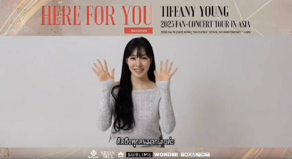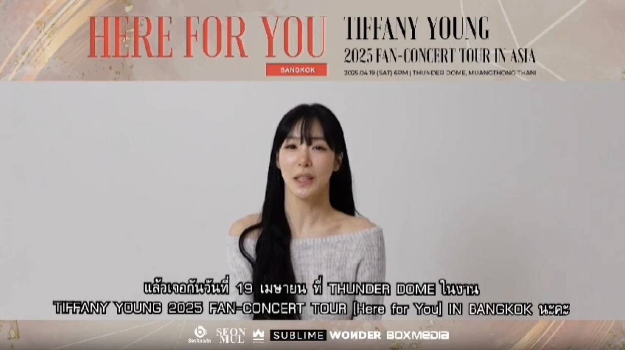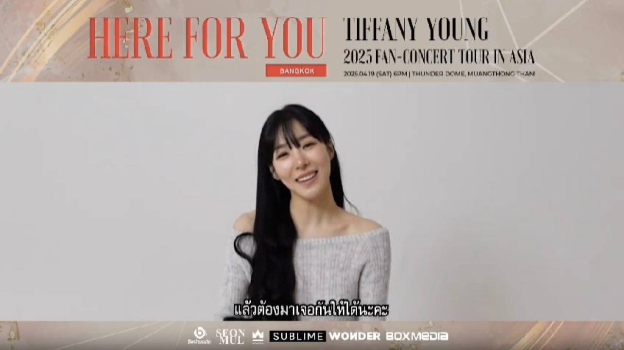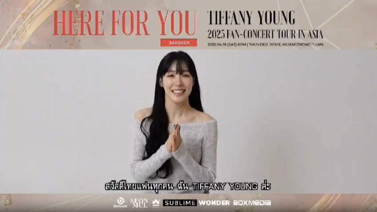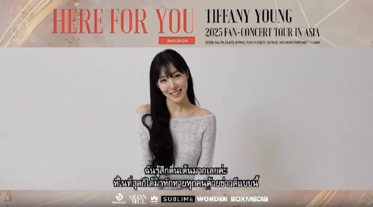 ทาง “ทิฟฟานี่ ” ก็ไม่พลาดที่จะส่งเสียงหวานๆ มาฝากทุกคน “สวัสดีค่ะ สวัสดีไทยแฟนทุกคน ฉัน ทิฟฟานี่ ยัง ค่ะ คิดถึงทุกคนมากเลยค่ะ ฉันรู้สึกตื่นเต้นมากเลยค่ะ ที่ในที่สุดก็ได้มาทักทายทุกคนด้วยข่าวดีแบบนี้ ในวันที่ 19 เมษายนนี้ เราจะได้เจอกันแล้วที่ ธันเดอร์ โดม กับงาน TIFFANY YOUNG 2025 FAN-CONCERT TOUR [Here for You] IN BANGKOK ทุกคนจะมาเจอกันใช่ไหมคะ ฉันกำลังตั้งใจเตรียมการแสดงสุดพิเศษสำหรับทุกคนไว้มากมายเลยค่ะ รายละเอียดเพิ่มเติมเกี่ยวกับงาน สามารถติดตามที่เพจ Bestwarin For You ได้เลยนะคะ ทุกคนคะ ได้โปรดตั้งตารอกันด้วยนะ แล้วต้องมาเจอกันให้ได้นะคะ แล้วเจอกันวันที่ วันที่ 19 เมษายน ที่ THUNDER DOME ในงาน TIFFANY YOUNG 2025 FAN-CONCERT TOUR [Here for You] IN BANGKOK นะคะ”