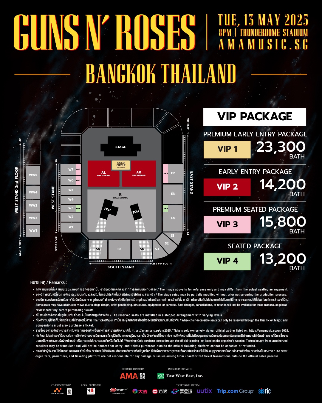 ในส่วนของบัตรเข้าชมคอนเสิร์ต Guns N’ Roses 2025 World Tour – Bangkok ณ ธันเดอร์โดม สเตเดียม จะเปิดจำหน่ายรอบพรีเซล Nightrain Presale พิเศษเฉพาะสมาชิกแฟนคลับอย่างเป็นทางการของวง Guns N’ Roses ในวันอาทิตย์ที่ 6 เมษายน 2568 นี้ ตั้งแต่เวลา 9:00 น. (ตามเวลาประเทศไทย) ดูรายละเอียดเพิ่มเติมได้ที่ https://amamusic.sg/nightrain
