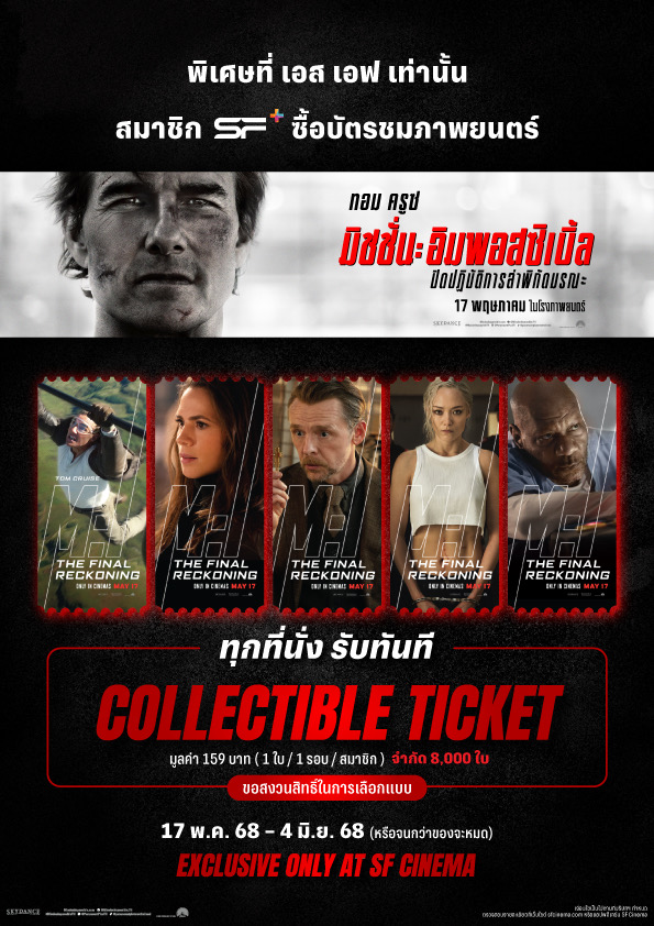 ● สมาชิก SF+ ที่ซื้อบัตรชมภาพยนตร์ “Mission: Impossible – The Final Reckoning” ทุกที่นั่งรับทันที SF+ Collectible Ticket ลิขสิทธิ์แท้จากภาพยนตร์ ( 1 ใบ / 1 รอบ / 1 สมาชิก ) มี 5 แบบให้สะสม ตั้งแต่วันที่ 17 พฤษภาคม – 4 มิถุนายน 2568 หรือจนกว่าสินค้าจะหมด·