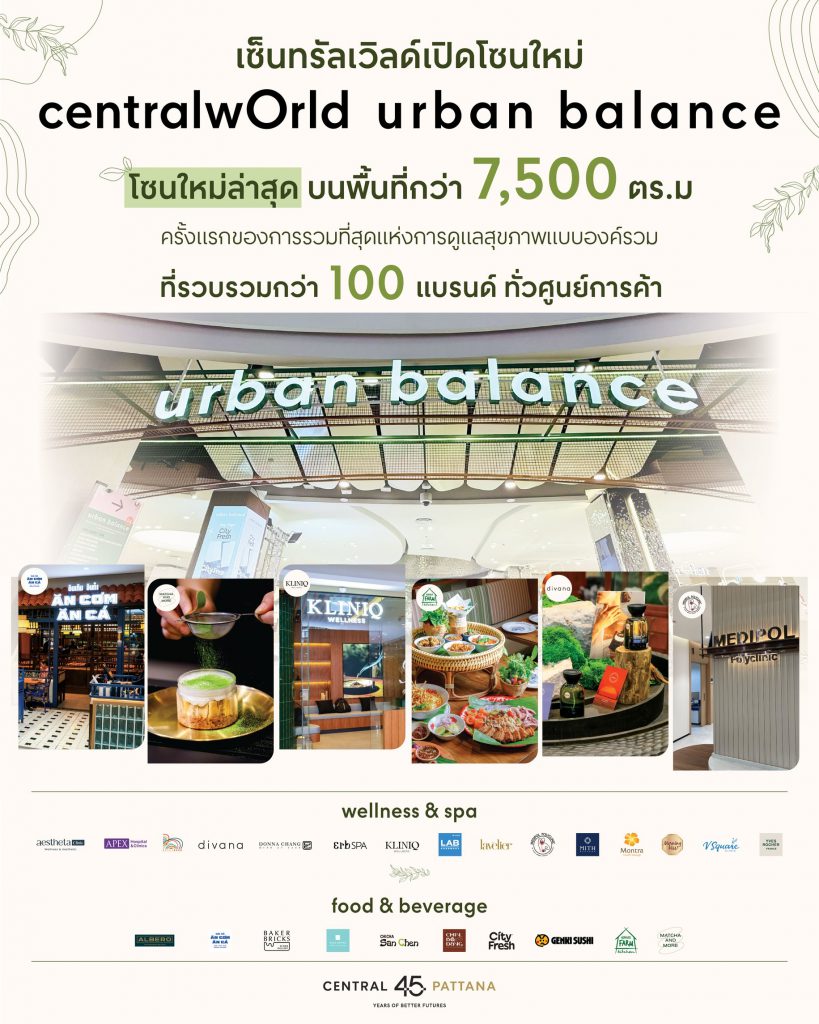 - เซ็นทรัลเวิลด์ ชวนเหล่าคนดังสัมผัสประสบการณ์โซนใหม่ ‘Urban Balance’ ตอบโจทย์ Well-being Lifestyle ครั้งแรกของการเป็นศูนย์รวมแห่งการดูแลสุขภาพแบบองค์รวม ครบทุกมิติทั้งAnti-Aging, Wellness, Beauty, Food & Fitness ให้คุณบาลานซ์ชีวิตได้ครบจบในที่เดียว