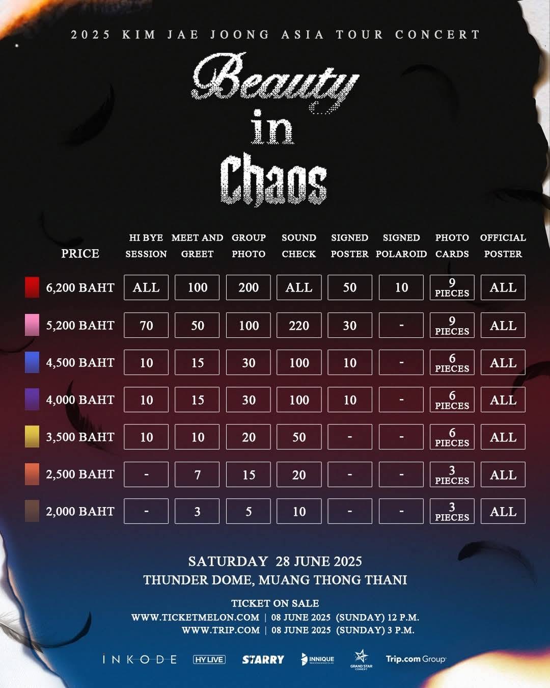 เตรียมกดบัตรในวันอาทิตย์ที่ 8 มิถุนายน 2568 เวลา 12:00 น. ทาง www.ticketmelon.com เวลา 15:00 น. บัตรราคาเริ่มต้นที่ 2000 / 2500 / 3500 / 4000 / 4500 / 5200 / 6200 เตรียมตัวเตรียมหัวใจให้พร้อมแล้วมาเจอกับร็อกสตาร์หนุ่มทรงเสน่ห์คิมแจจุงกันได้เลย!!