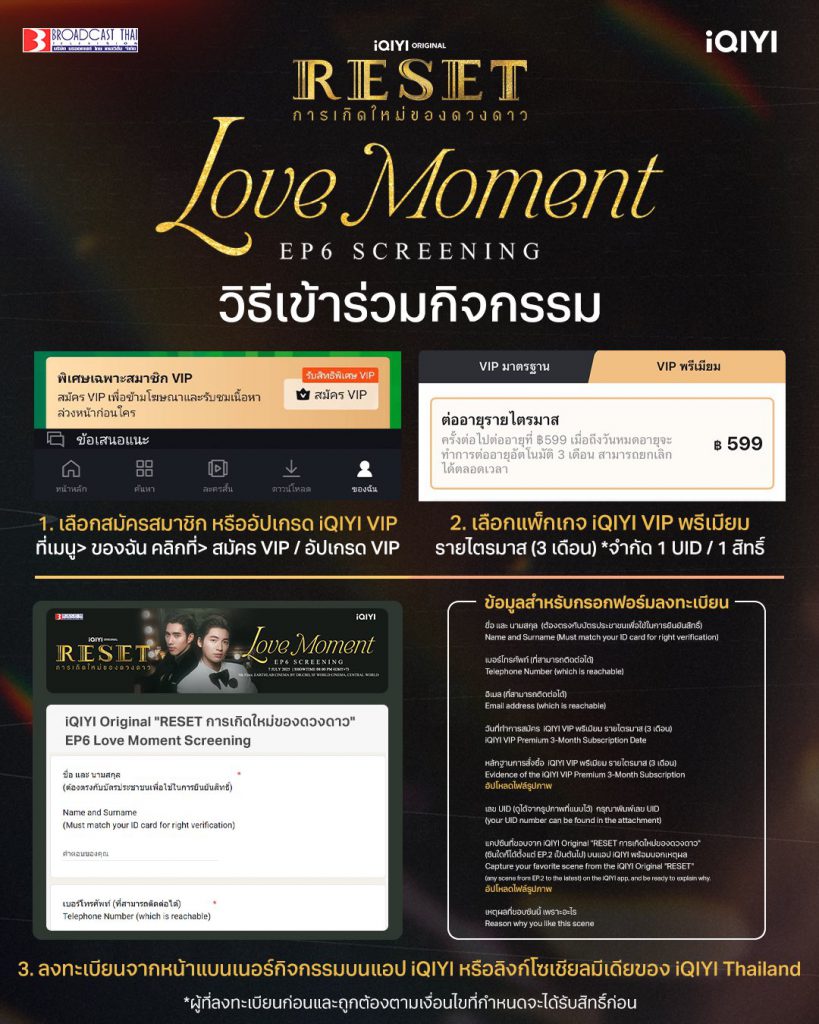 มาร่วมเป็นส่วนหนึ่ง พร้อมทั้งดื่มด่ำกับค่ำคืนสุดพิเศษบนจอยักษ์ไปพร้อมกับพวกเขาได้ในงาน “iQIYI Original “RESET การเกิดใหม่ของดวงดาว” Love Moment EP6 Screening” สามารถติดตามรับชม iQIYI Original “RESET การเกิดใหม่ของดวงดาว” ดูสดพร้อมกัน ทุกวันจันทร์ เวลา 22.30 น. ทางช่อง 3HD และดูออนไลน์เวอร์ชัน UNCUT เวลา 22.45 น. บนแอป iQIYI (อ้ายฉีอี้) และเว็บ www.iQ.com ที่เดียวเท่านั้น