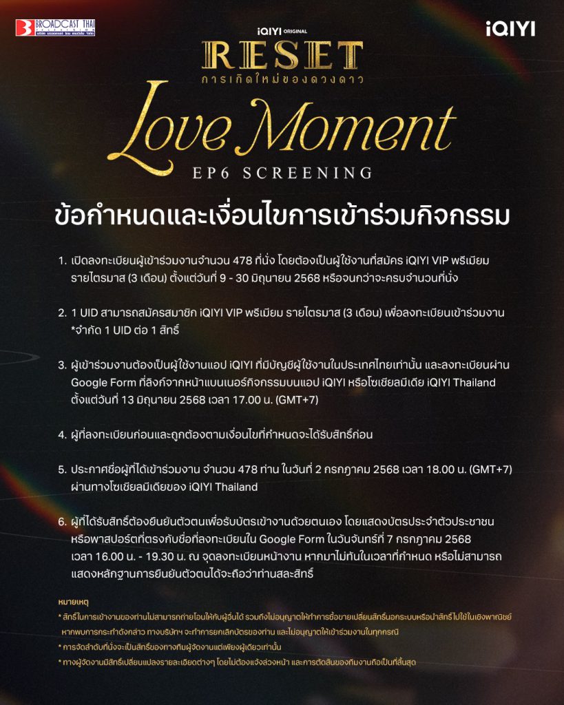 ล่าสุด iQIYI (อ้ายฉีอี้) ร่วมกับ บรอดคาซท์ ไทย เทเลวิชั่น จำกัด ขอพาแฟน ๆ อินและฟินมากขึ้นกว่าเคยด้วยการจัดกิจกรรมสุดเอ็กซ์คลูซีฟ “iQIYI Original “RESET การเกิดใหม่ของดวงดาว” Love Moment EP6 Screening” ที่แฟน ๆ จะได้รับชม EP6 พร้อมกระทบไหล่นักแสดงนำสุดใกล้ชิดไปด้วยกัน โดยจะจัดขึ้นในวันที่ 7 กรกฎาคม 2568 ณ โรงภาพยนตร์ EARTHLAB CINEMA BY DR.CBD, SF WORLD CINEMA, CENTRAL WORLD ชั้น 9