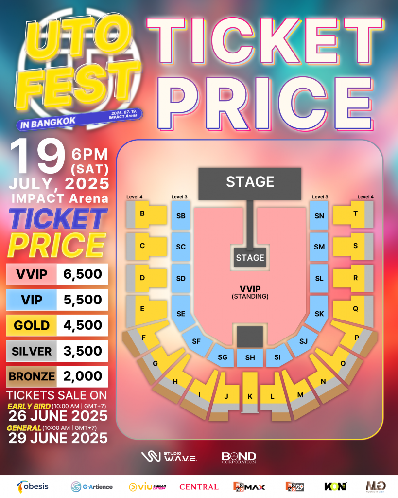 เสริมทัพความสนุก จัดเต็มจาก SUHO (EXO), KEY (SHINee) และ DICE ด้วย นอกจากนี้ยังจะมี Special Stage จากศิลปินรุ่นใหม่ อย่าง วง cosmosy เกิร์ลกรุปจากประเทศญี่ปุ่น และ COiBLEN ศิลปินสุดพิเศษที่จะมาช่วยกันเติมพลังความมันส์กันให้กับเวที 2025 UTO FEST IN BANGKOK (ยูโต เฟส อิน แบงค็อก) วันเสาร์ที่ 19 กรกฎาคม 2568 ณ IMPACT Arena (อิมแพค อารีน่า) บัตรราคา (VVIP) 6500, (VIP) 5500, (GOLD) 4500, (SILVER) 3500 และ (BRONZE) 2000 บาท