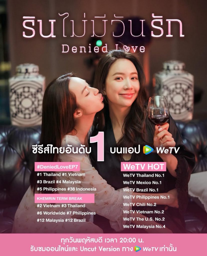 ยิ่งออนแอร์ยิ่งปัง! “รินไม่มีวันรัก” (Denied Love) เข้าสู่ EP.7 พร้อมสร้างกระแสบนโซเชียลอีกระรอก เมื่อ “คุณริน” หรือแพรนรินทร์ เทิร์นโพอย่างเป็นทางการ จนแฟนคลับพร้อมใจกันส่งแฮชแทกดันขึ้นเทรนด์อันดับ 1 ในไทย และเวียดนาม และยังคงติดอันดับซีรีส์ไทยอันดับ 1 บนแอป WeTV ไทยและอีกหลายๆประเทศทั่วโลก อาทิเช่น Maxico , Brazil , Philippines เป็นต้น