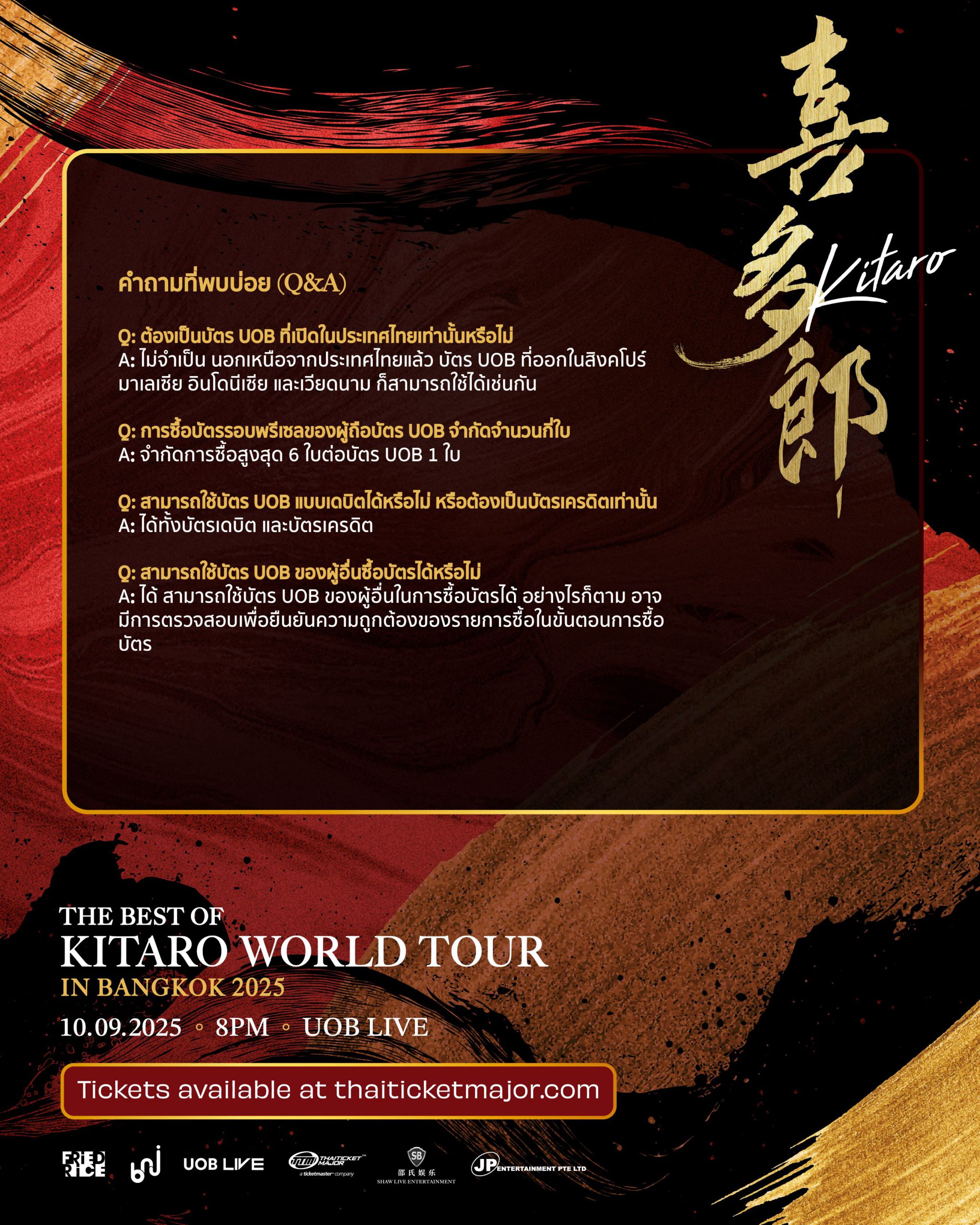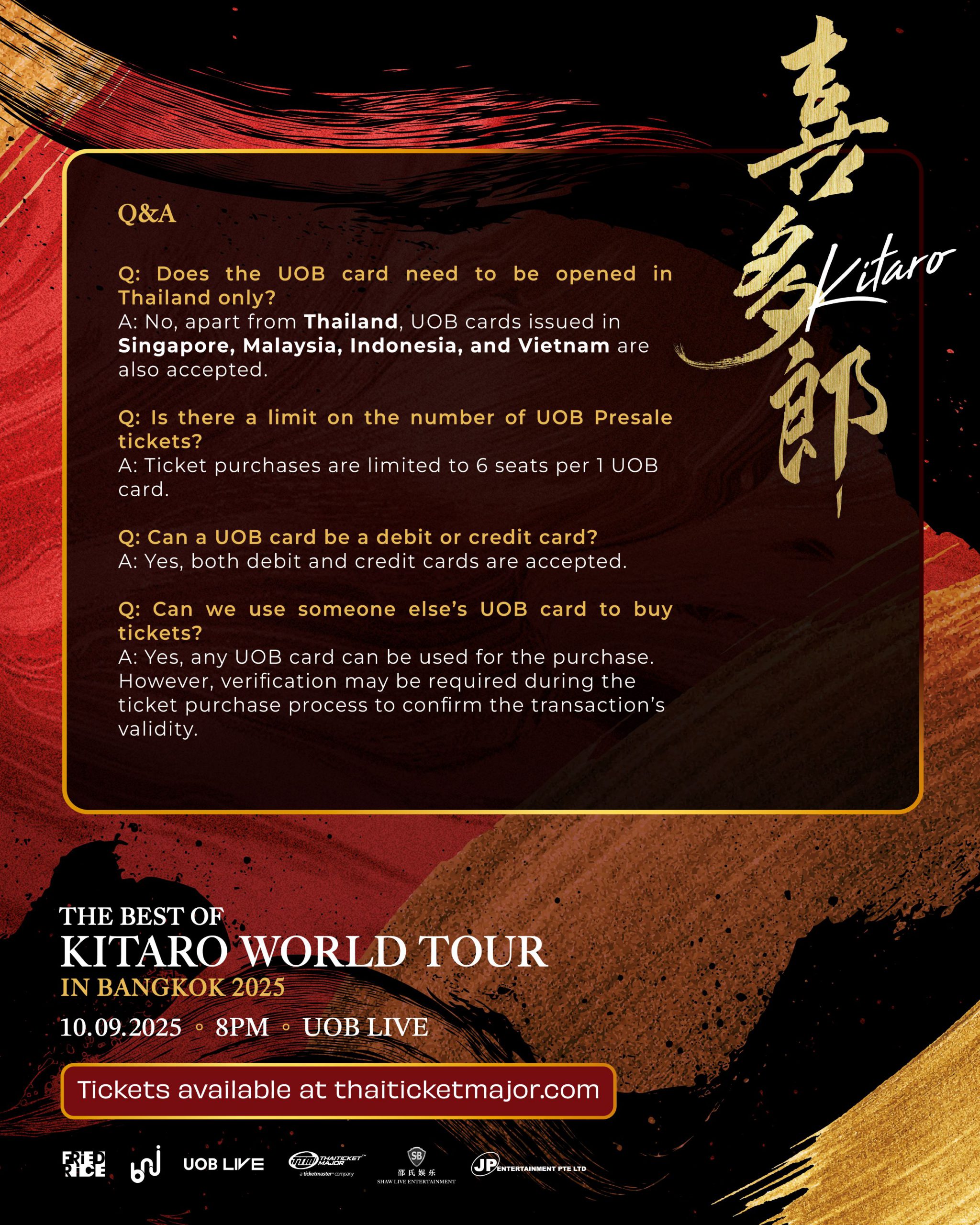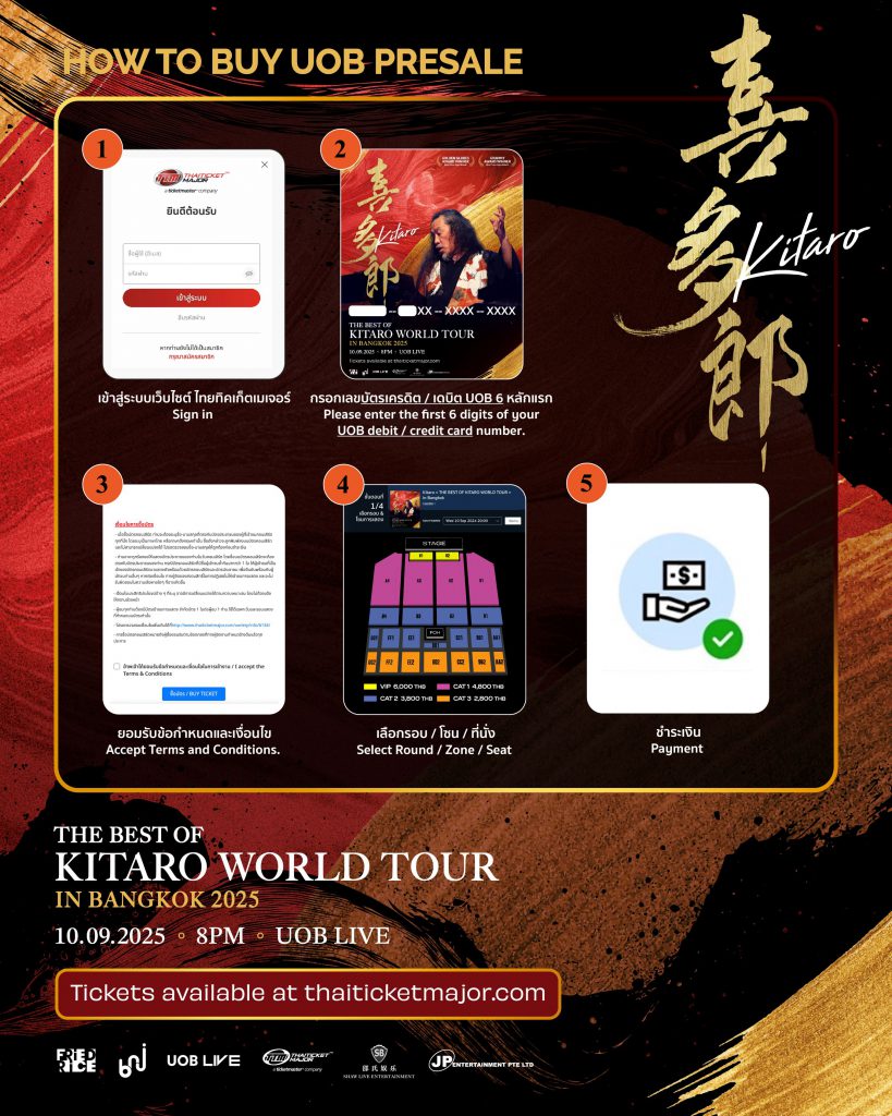 ผู้ถือบัตร UOB ในประเทศไทย สิงคโปร์ อินโดนีเซีย มาเลเซีย และเวียดนาม มีสิทธิ์ซื้อบัตรก่อนใคร โดยรอบพรีเซล UOB จะเปิดตั้งแต่วันที่ 29 กรกฎาคม 2568 เวลา 10:00 น. – 23:59 น. (เวลาไทย) การขายบัตรรอบทั่วไปสำหรับ THE BEST OF KITARO WORLD TOUR IN BANGKOK 2025 จะเริ่มวันที่ 30 กรกฎาคม 2568 เวลา 10:00 น. ผ่านเว็บไซต์ ThaiTicketMajor.com