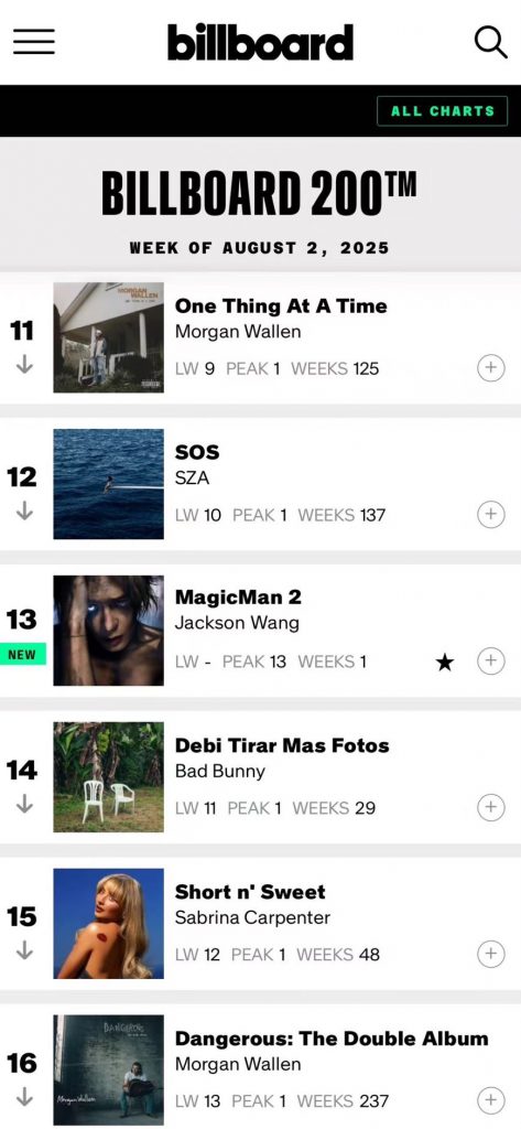 ปังอยู่! ปังต่อ! ปังให้โลกรู้! “แจ็คสัน หวัง” (JACKSON WANG) พาอัลบั้ม MAGICMAN 2 ที่เพิ่งปล่อยเมื่อวันที่ 18 กรกฎาคมที่ผ่านมา เปิดตัวแรงตั้งแต่สัปดาห์แรก ทะยานขึ้นอันดับ 13 บนชาร์ต Billboard 200 สร้างสถิติใหม่เป็นอัลบั้มเปิดตัวที่ทำอันดับสูงที่สุดจากศิลปินชาวจีนในประวัติศาสตร์ของชาร์ต Billboard 200