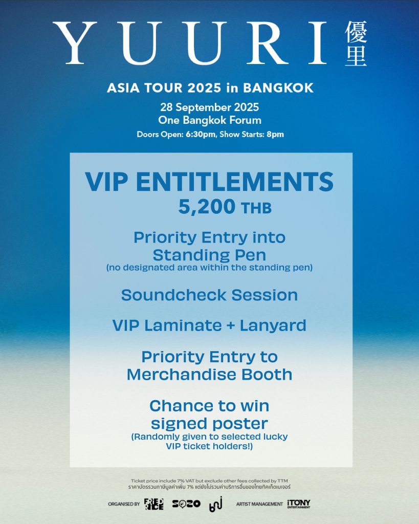 การจำหน่ายบัตรสำหรับงาน YUURI Asia Tour 2025 – Bangkok จะเริ่มขึ้นในวันที่ 31 สิงหาคม 2025 เวลา 12:00 น. (ตามเวลาประเทศไทย) ผ่านทาง thaiticketmajor.com