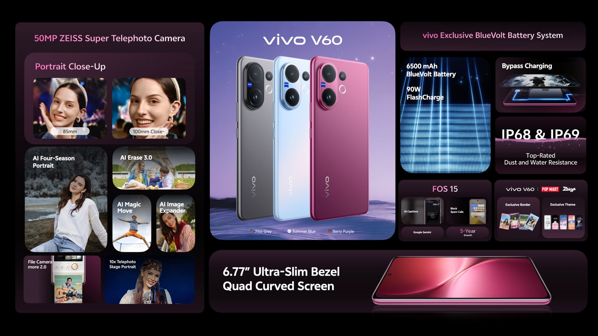 vivo V60 ยังคงตอกย้ำจุดยืนด้านการเป็นสมาร์ตโฟนพอร์ตเทรตระดับโปรด้วยการร่วมมือกับ ZEISS ในการพัฒนานวัตกรรมกล้องถ่ายภาพ โดยเป็นครั้งแรกของตระกูล V Series ที่มาพร้อมกล้อง ZEISS Super Periscope Telephoto ความละเอียด 50 ล้านพิกเซล รองรับการซูมออปติคอลได้ถึง 3 เท่า และซูมแบบไฮเปอร์ (Hyper Zoom) ได้ไกลสุด 100 เท่า เสริมด้วยกล้องหลัก ZEISS ความละเอียด 50 ล้านพิกเซล พร้อมระบบกันสั่น OIS และกล้องหน้า ZEISS Group Selfie Camera ความละเอียด 50 ล้านพิกเซล มุมมองกว้าง 92 องศา เพื่อรองรับการถ่ายเซลฟี่แบบกลุ่มอย่างคมชัดทุกรายละเอียด