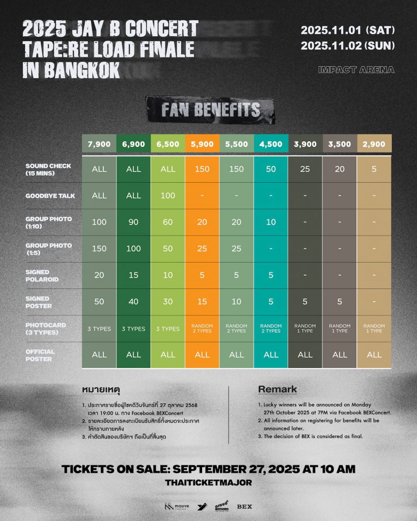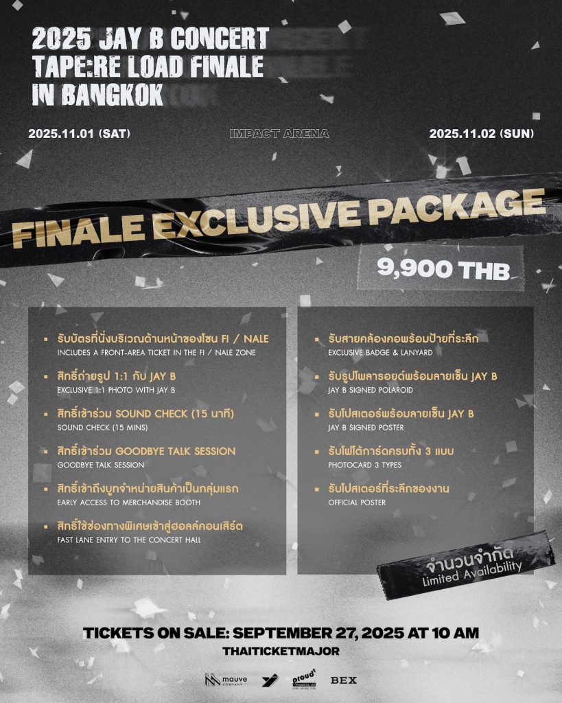 โดยงาน 2025 JAY B CONCERT [TAPE:RE LOAD FINALE] IN BANGKOK จะถูกจัดขึ้น 2 รอบการแสดงในวันเสาร์ที่ 1 พฤศจิกายน 2568 และ วันอาทิตย์ที่ 2 พฤศจิกายน 2568 เวลา 18:00 น. ณ อิมแพ็ค อารีน่า เมืองทองธานี บัตรราคา 9,900 / 7,900 / 6,900 (บัตรยืน) / 6,500 / 5,900 / 5,500 / 4,500 / 3,900 / 3,500 และ 2,900 บาท โดยแต่ละราคาจะได้รับสิทธิพิเศษ ดังนี้