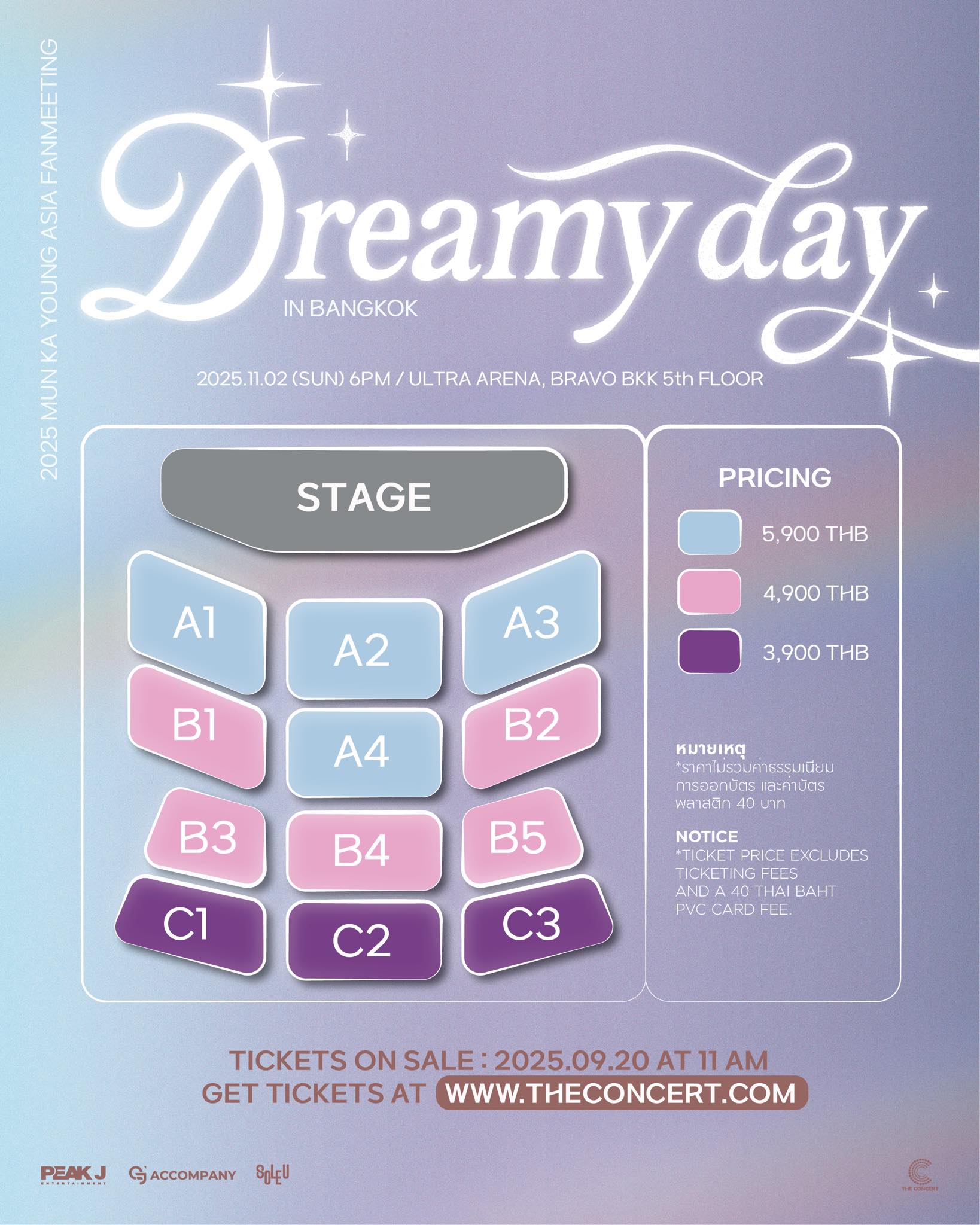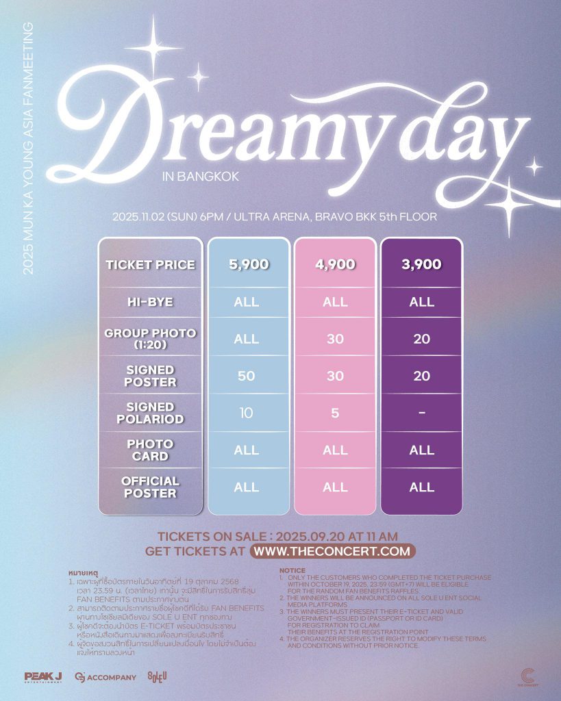 แฟน ๆ ชาวไทยเตรียมล็อควันปักหมุดกดบัตรพร้อมกัน ในวันเสาร์ที่ 20 กันยายน 2568 เวลา 11.00 น. เป็นต้นไป ซื้อบัตรได้ที่ https://www.theconcert.com/concerts/2025-mun-ka-young-asia-fanmeeting-in-bangkok