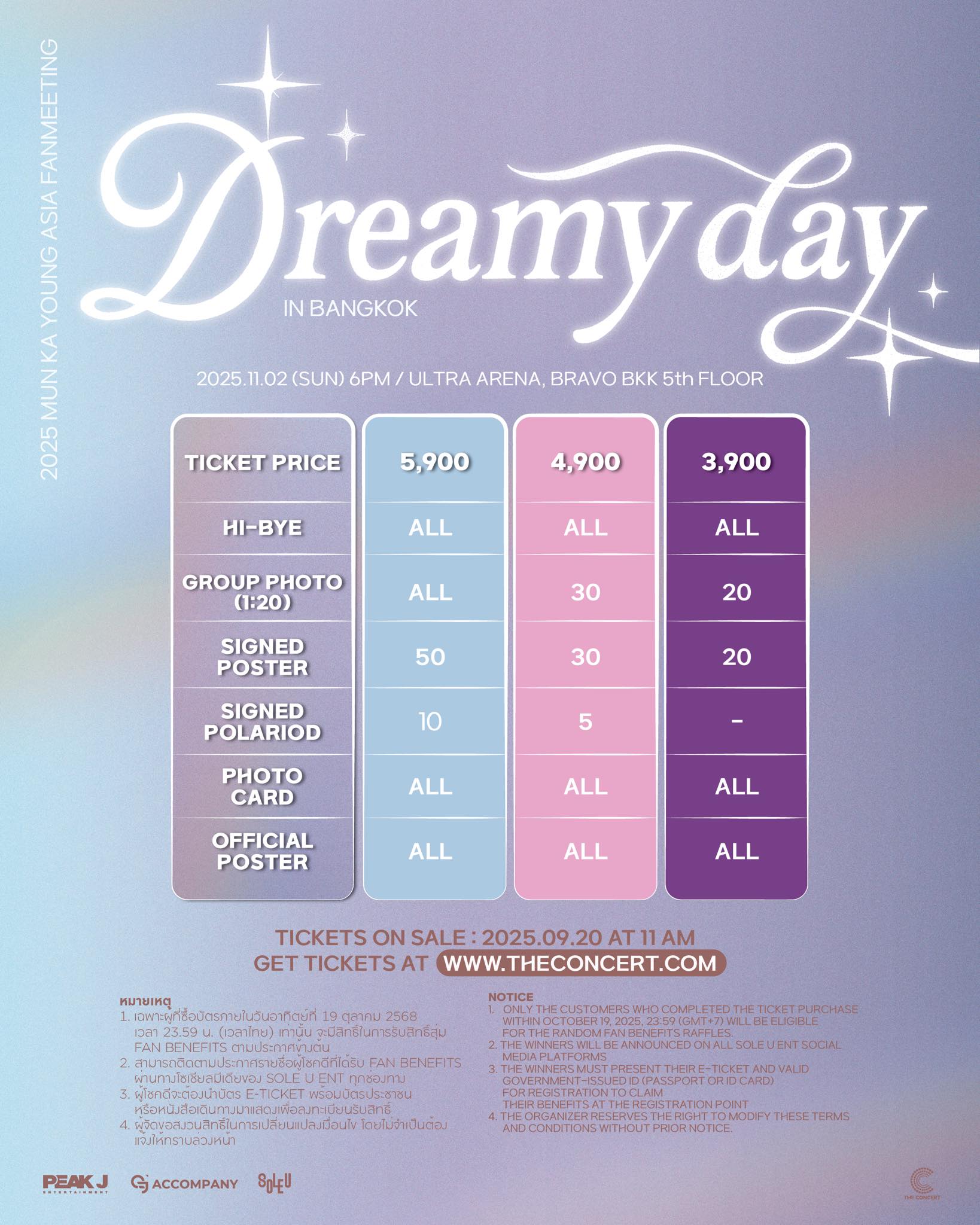 หรือผ่านทางแอปพลิเคชัน The Concert เท่านั้น ราคาบัตร 5,900 / 4,900 / 3,900 บาท (ราคาไม่รวมค่าธรรมเนียมการออกบัตรและค่าบัตรพลาสติก) พร้อมได้รับสิทธิ์ All Hi-Bye ทุกที่นั่ง และลุ้นสิทธิ์เป็นผู้โชคดีรับสิทธิ์สุ่ม Fan Benefits เพียงซื้อบัตรภายในวันที่ 20 กันยายน – 19 ตุลาคม 2568 เวลา 23.59 น. เท่านั้น มาร่วมสร้างความทรงจำที่เหมือนฝันให้เป็นจริงด้วยกันกับ “มุนกายอง” ไปด้วยกัน